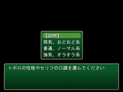 タイトル画面から「スタート」を選び、 主人公の名前を入力します。 (ディフォルト名「トポロ」) 名前を決めたら、主人公のイメージを選びます。 |