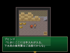 @宿屋 序盤のセーブポイント。(注:体験版では通常セーブはできません) 下水に暮らす者たちの宿泊施設。ここで眠ることで1日が終ります。 疲れは取れませんが床で眠れば無料で泊めてもらえます。 | |